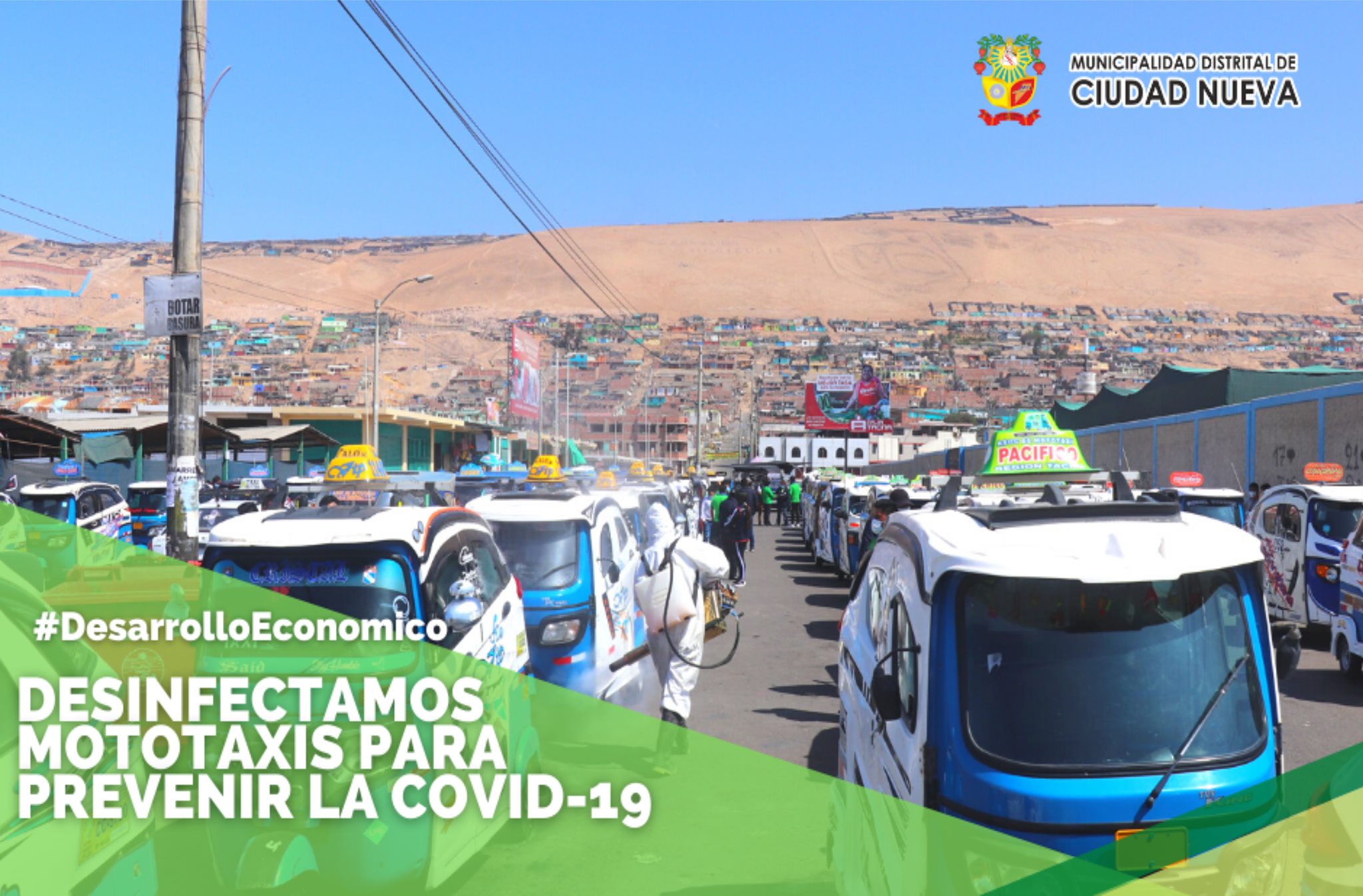 Un total de 115 mototaxis pertenecientes a las empresas Pacífico Sur, Villa Frontera, Moto Vip 1140, Virgen de Copacabana y Pacífico Ciudad Nueva fueron desinfectadas por nuestro personal con ayuda de motopulverizadores con el fin de evitar la propagación de la Covid-19 y resguardar la salud de los pobladores.